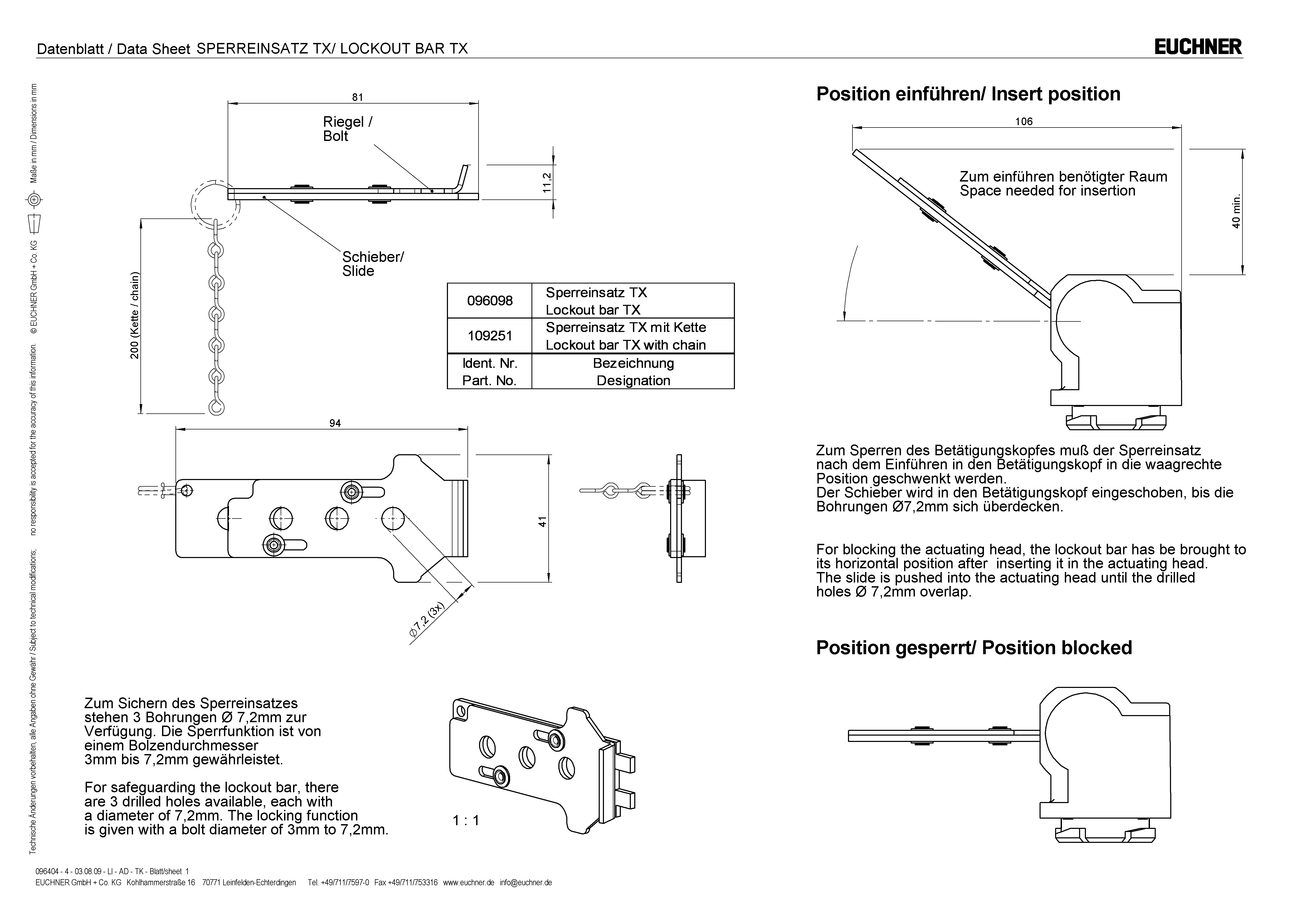 Při otevřených ochranných dveřích se dá místo aktuátoru zasunout do ovládací hlavy v konstrukčním provedení 2 (NX/TX). Proti odstranění se zabezpečuje běžným visacím zámkem. Slouží k ochraně osob v prostorách, v nichž může hrozit nebezpečí.