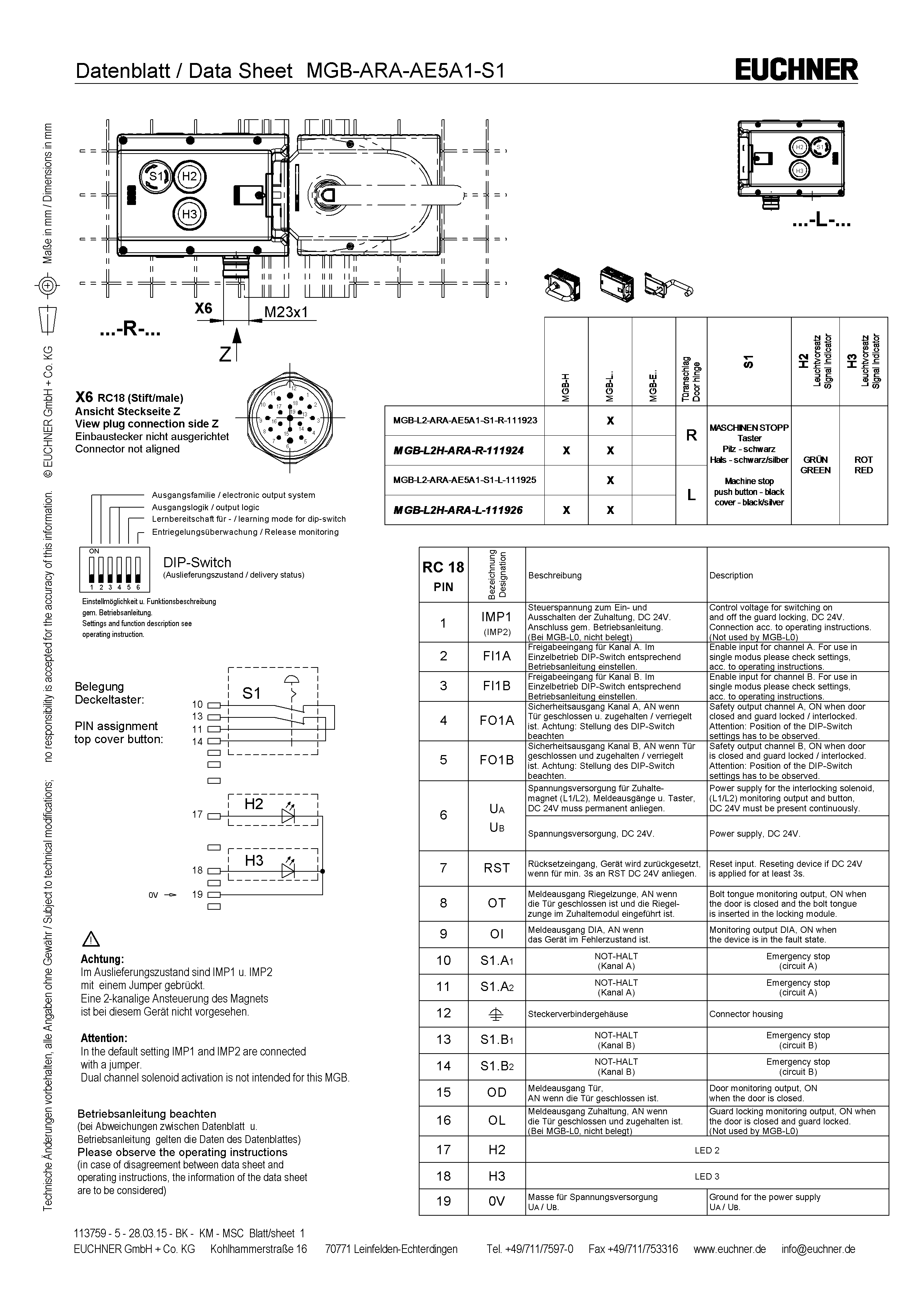 S1 | 2 nuceně rozpínané kontakty a 1 spínací kontakt, tlačítko nouzového zastavení s odjištěním otočením, neprosvětlené |