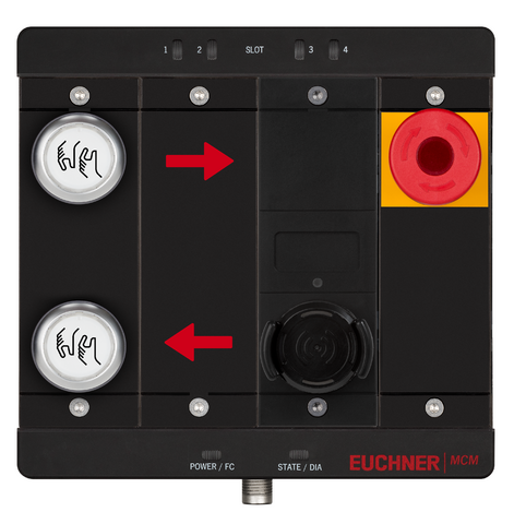 Modul MCM Modular lze ke sběrnicovému modulu připojit přímo nebo odděleně, a lze ho tak používat jako ovládací terminál. Je možné ho použít také k rozšíření možností obsluhy na vyhodnocovacím modulu s jištěním ochranného krytu. Modul MCM Modular nabízí čtyři sloty pro upevnění submodulů.