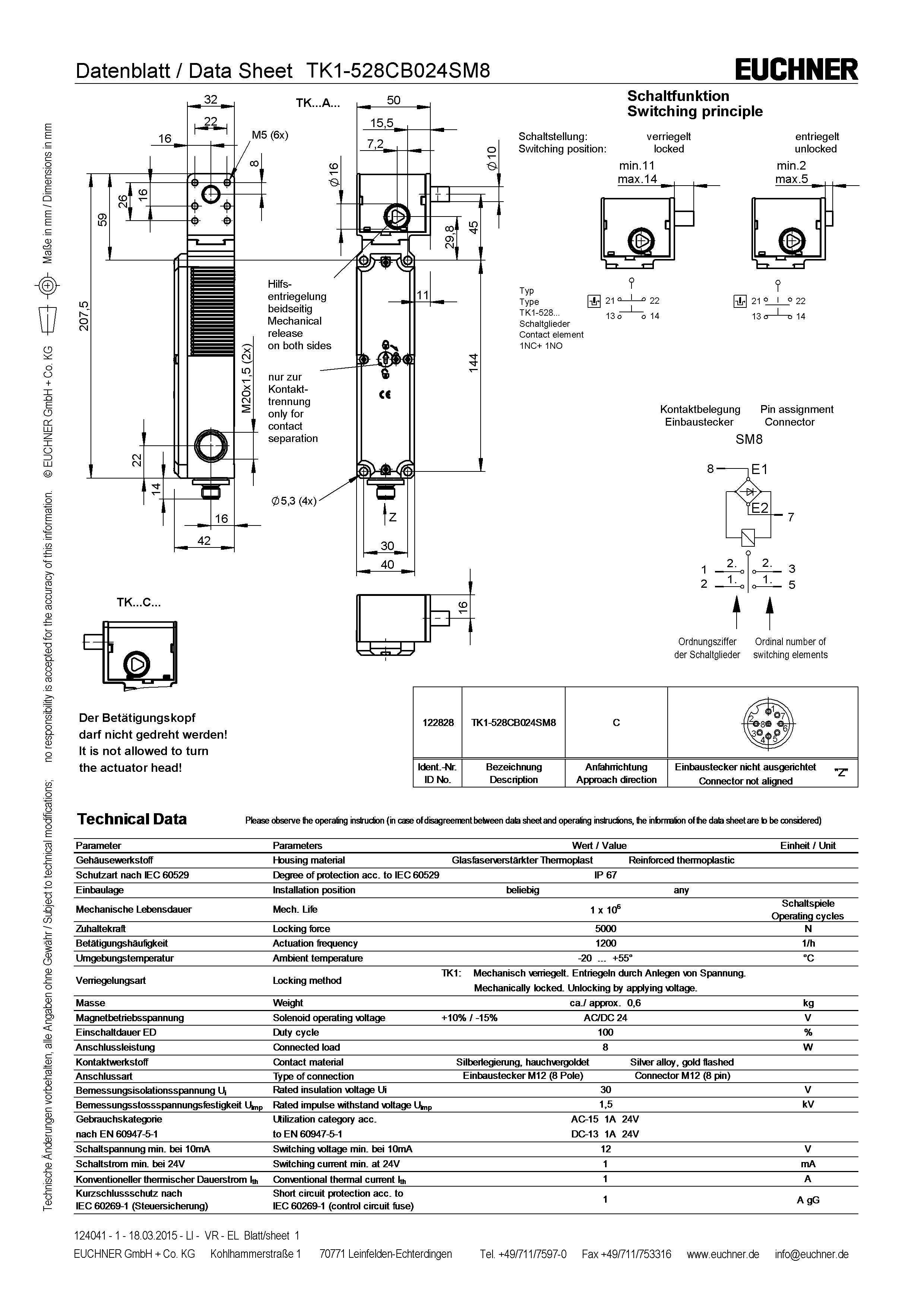 Kontakty pro signalizaci stavu jištění ochranného krytu: 1× nuceně rozpínaný kontakt |