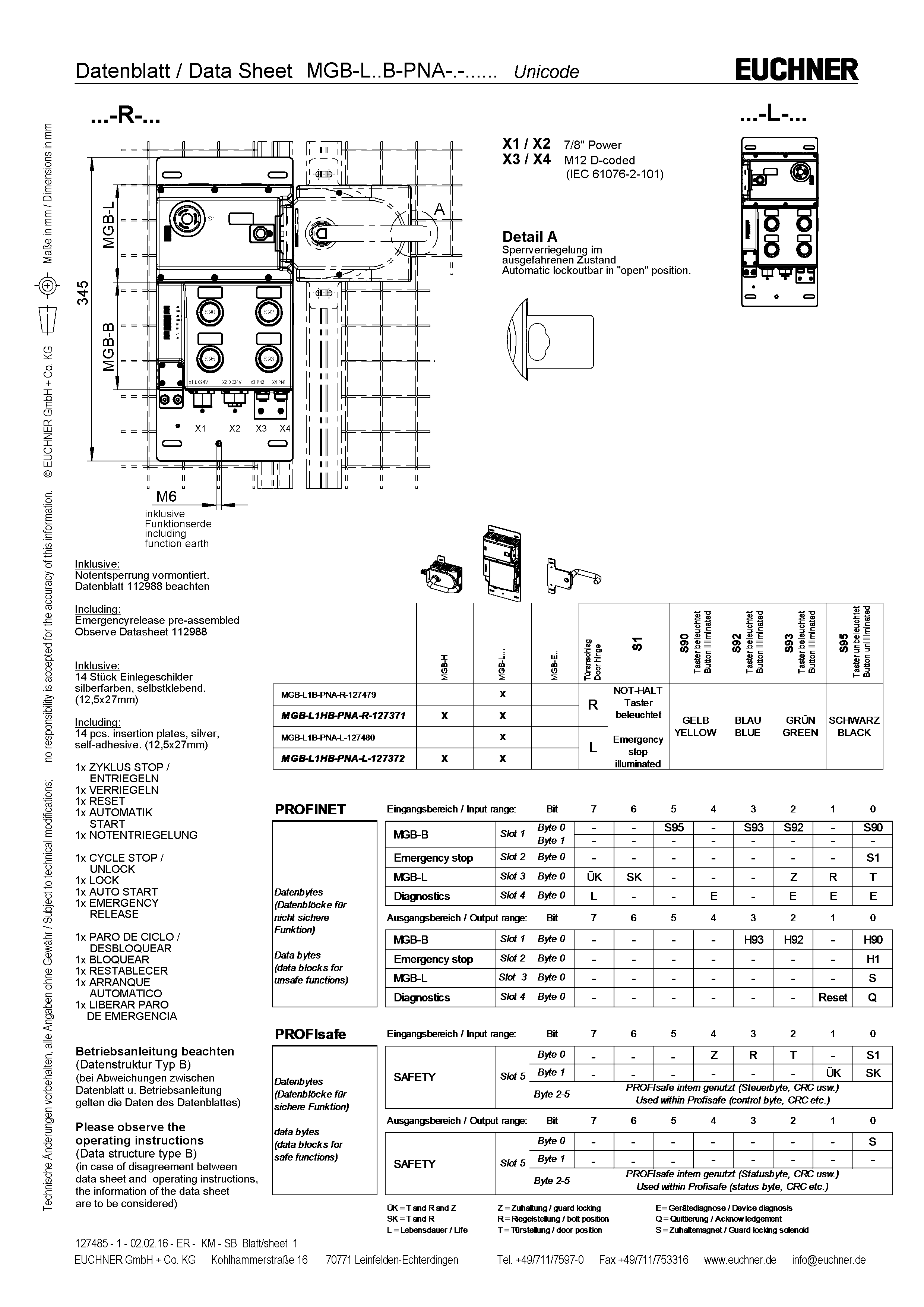 Vyhodnocovací modul a sběrnicový modul MGB-L1...-PN... (Jištění ochranného krytu silou pružiny), 5× ovládací prvek, nouzový odjišťovací prvek, zástrčka 7/8" a M12