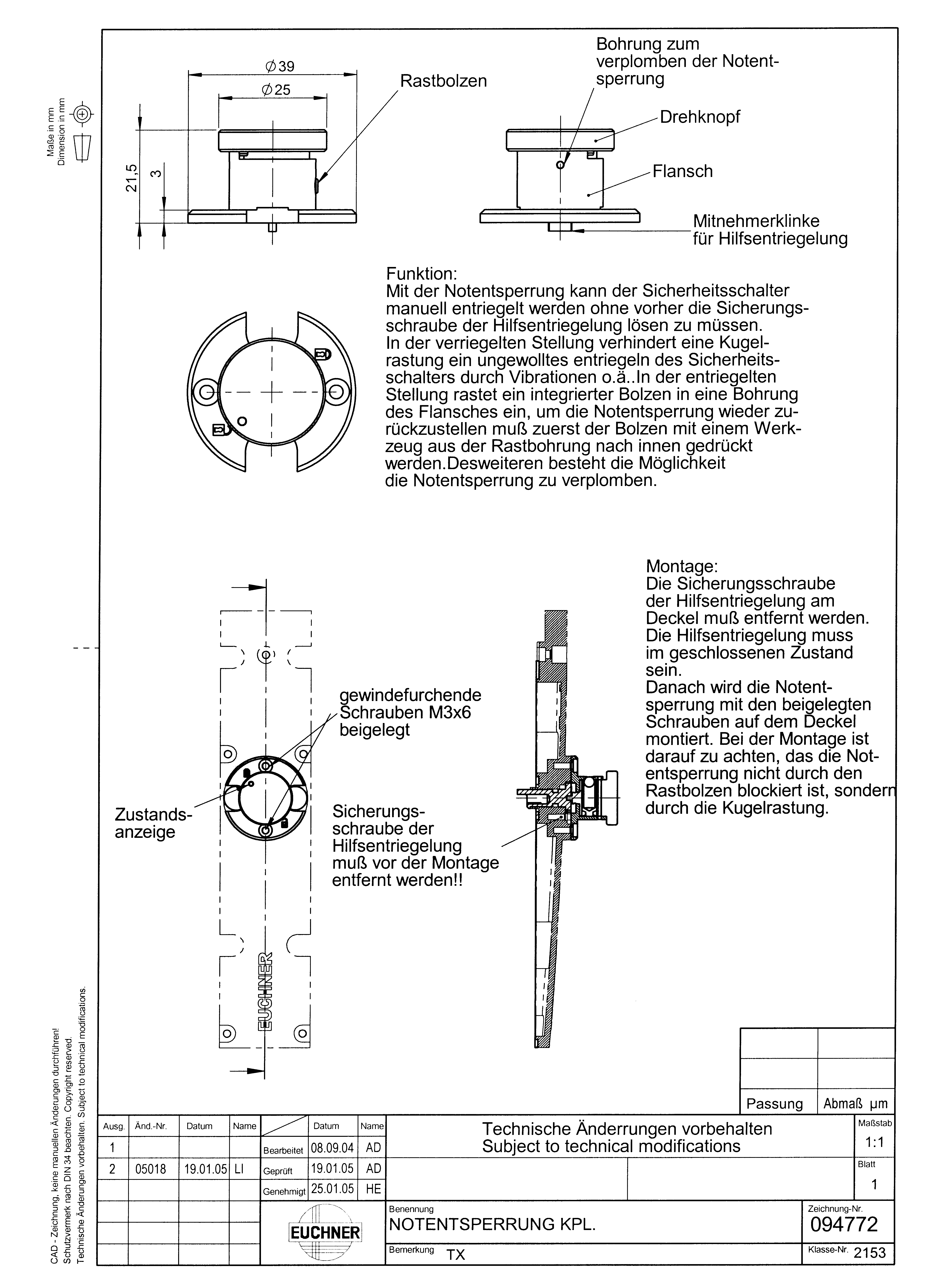 Dient im Gefahrenfall zum Entsperren der Zuhaltung ohne Hilfsmittel. Das Aufheben der Blockierung und das Wiederherstellen der Betriebsbereitschaft erfordern einen einer Reparatur vergleichbaren Aufwand. Eine Plombe kann zur Sicherung gegen Manipulation angebracht werden.