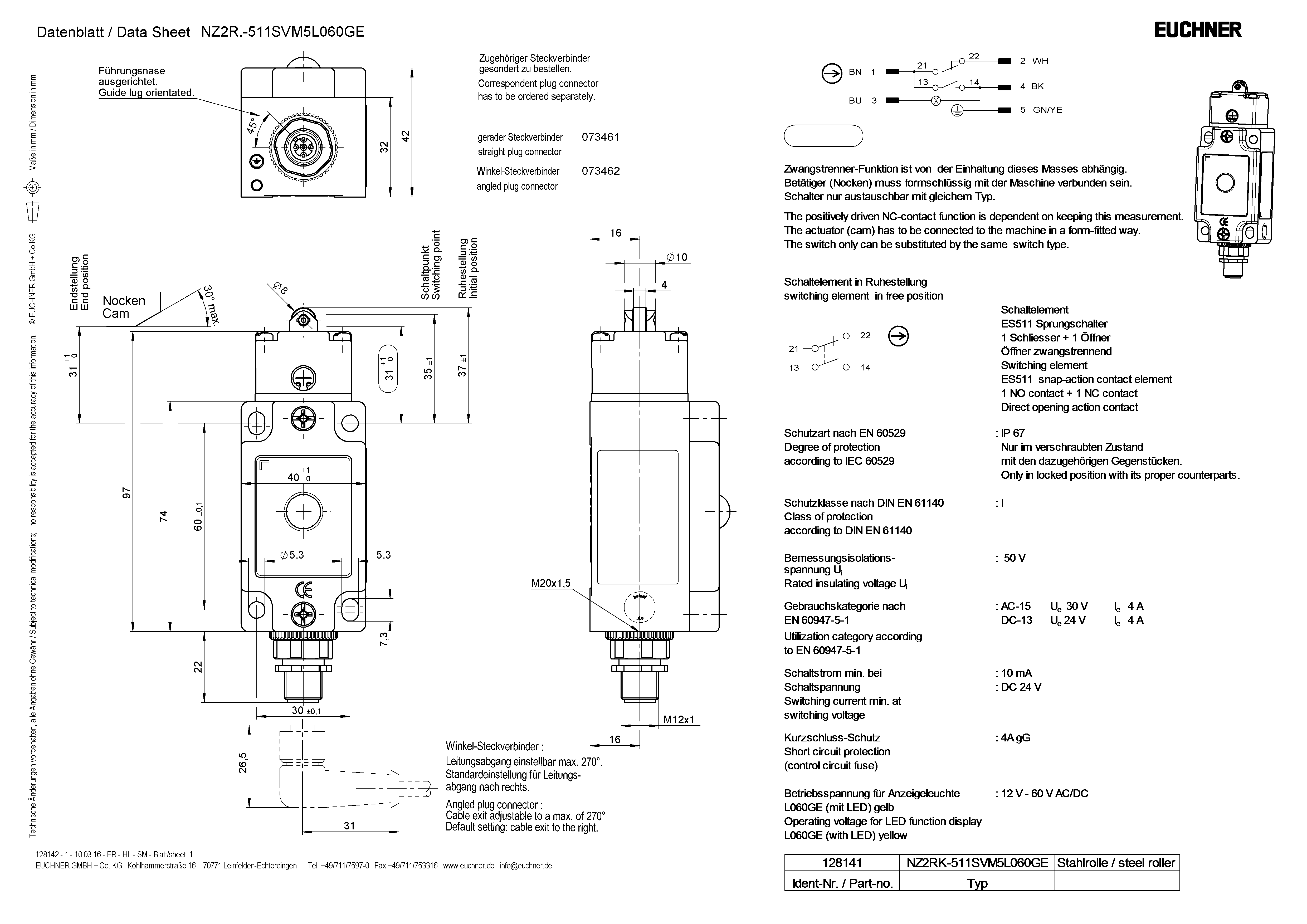 | 10 | Schaltelement in Ruhestellung: Schaltelement ES511 Sprungschalter 1 Schliesser + 1 Öffner, Öffner zwangstrennend |