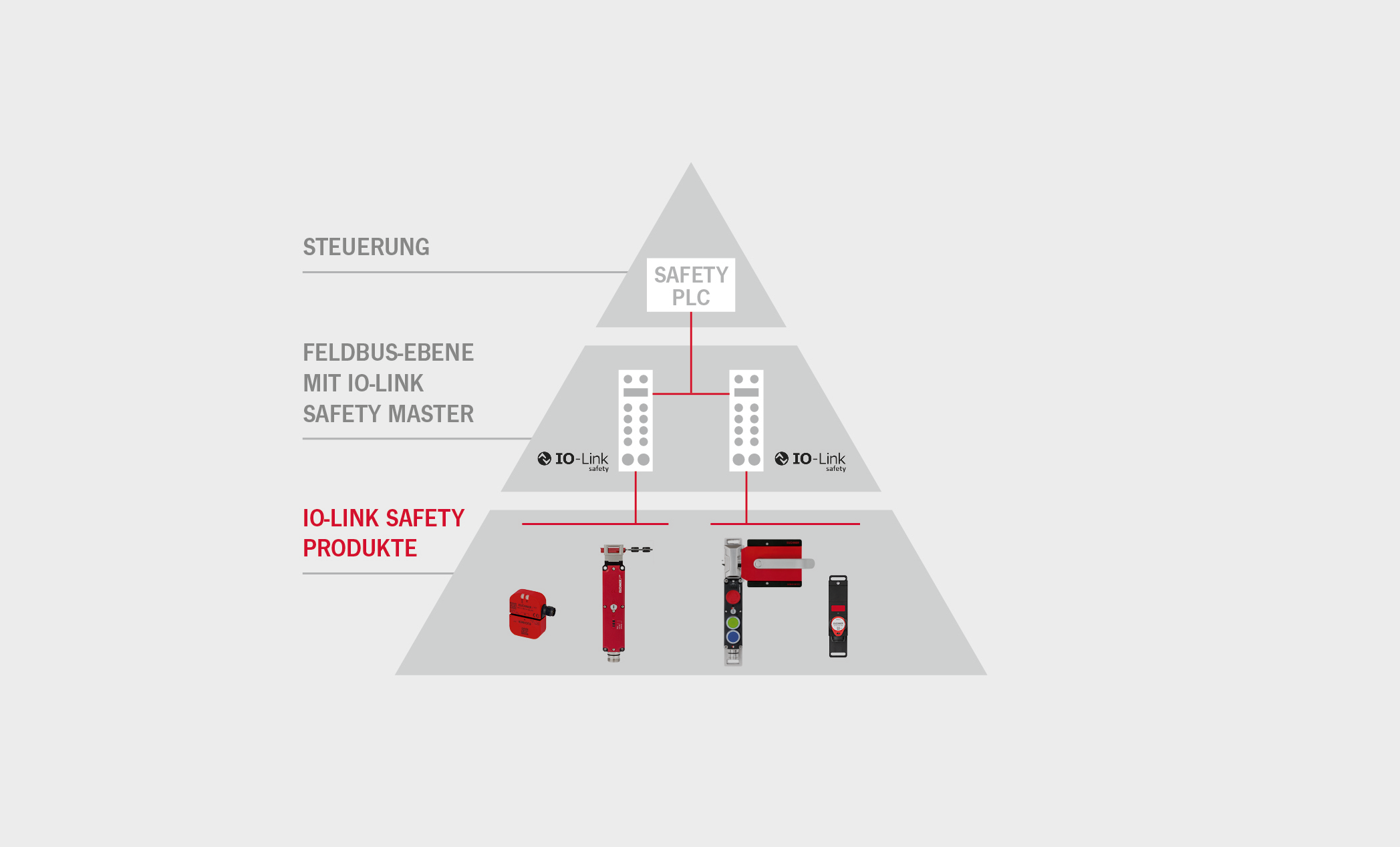 Die Antwort ist IO-Link Safety. Eine Erweiterung des bewährten IO-Link-Protokolls, die Sicherheits- und Zusatzdaten gemeinsam über eine einzige Punkt-zu-Punkt-Verbindung an einen IO-Link Safety Master überträgt – bis SIL3 / PL e, standardisiert nach IEC 61131‑2.