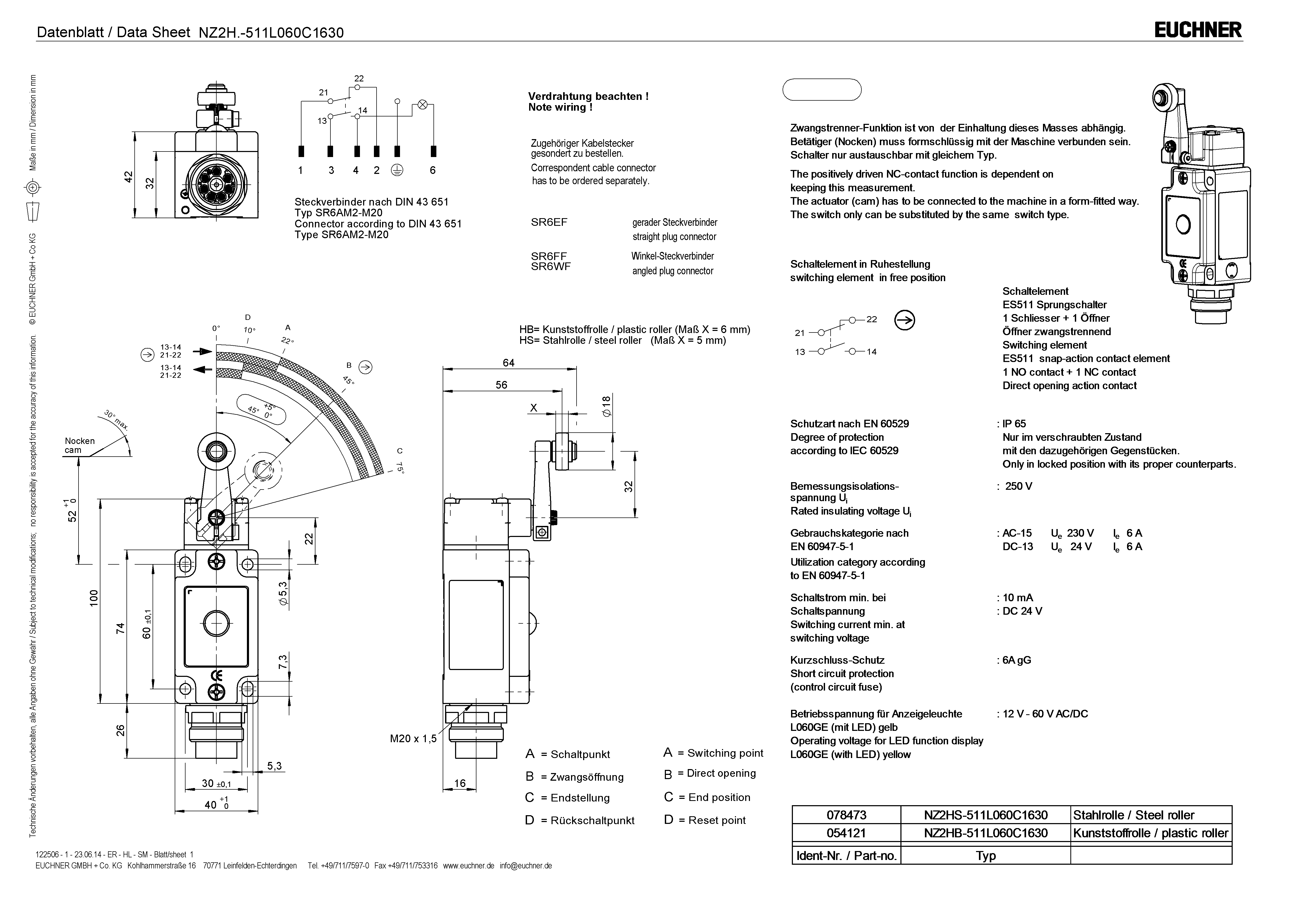 Sicherheitsschalter NZ.HB, Schwenkhebel mit Kunststoffrolle, Steckverbinder SR6