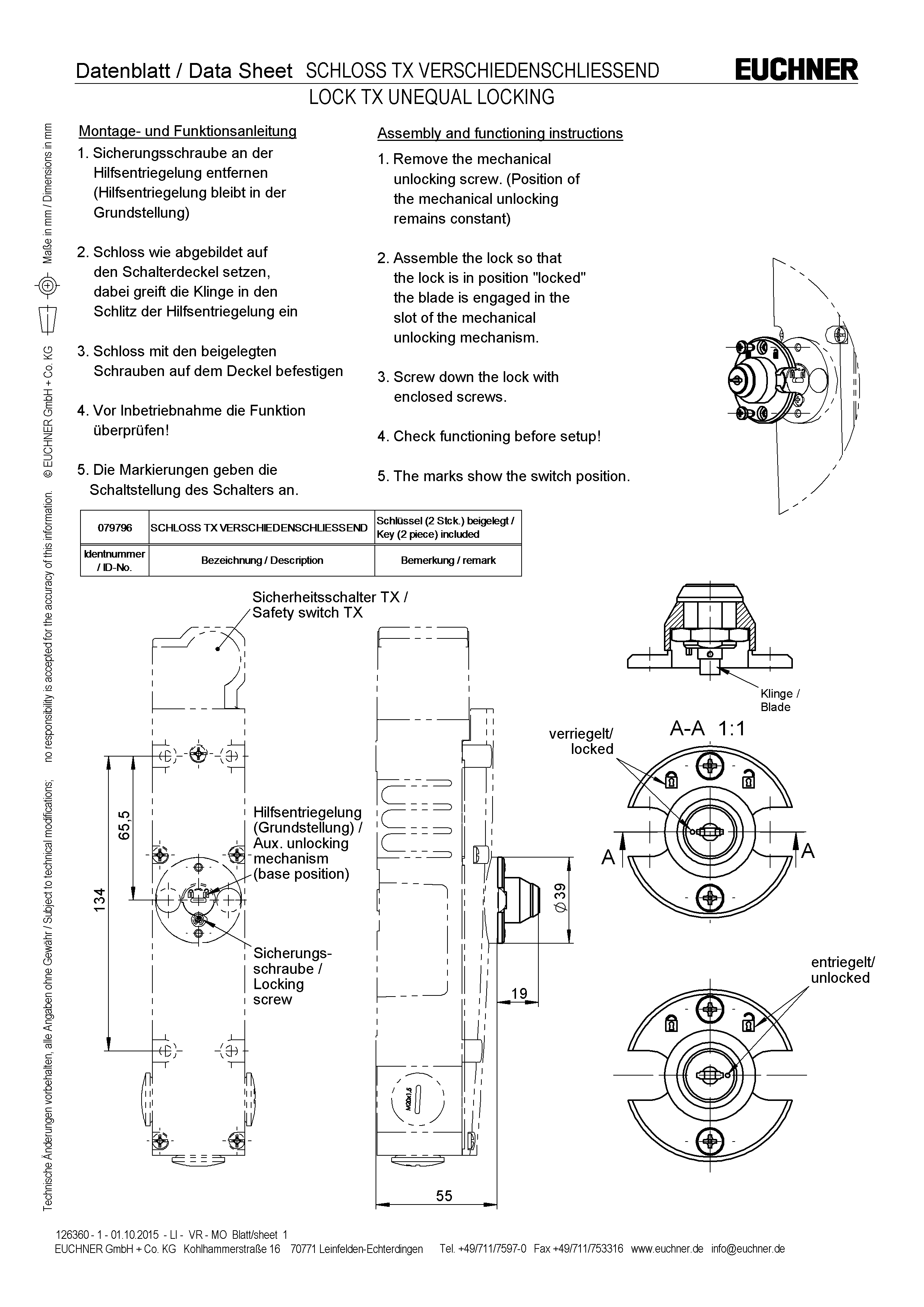 The lock is used in combination with safety switch TX. The auxiliary key release enables authorized personnel to actuate the auxiliary release using the related key. The unlocking mechanism holds the solenoid in the “unlocked” position. 2 screws are used to fix the lock to the cover of the safety switch TX (above the auxiliary release).