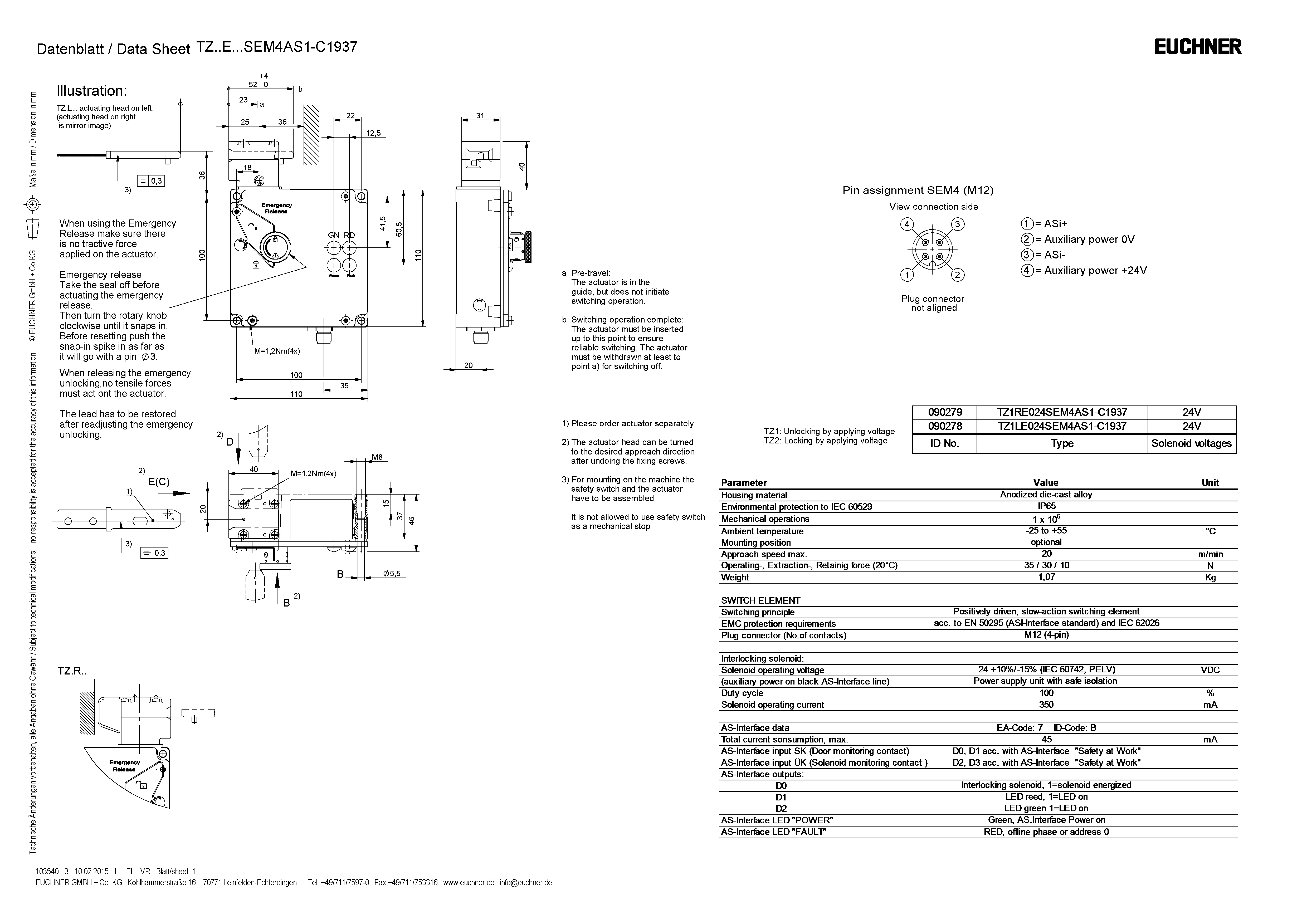 Safety switch TZ ASi, plug connector M12, emergency release