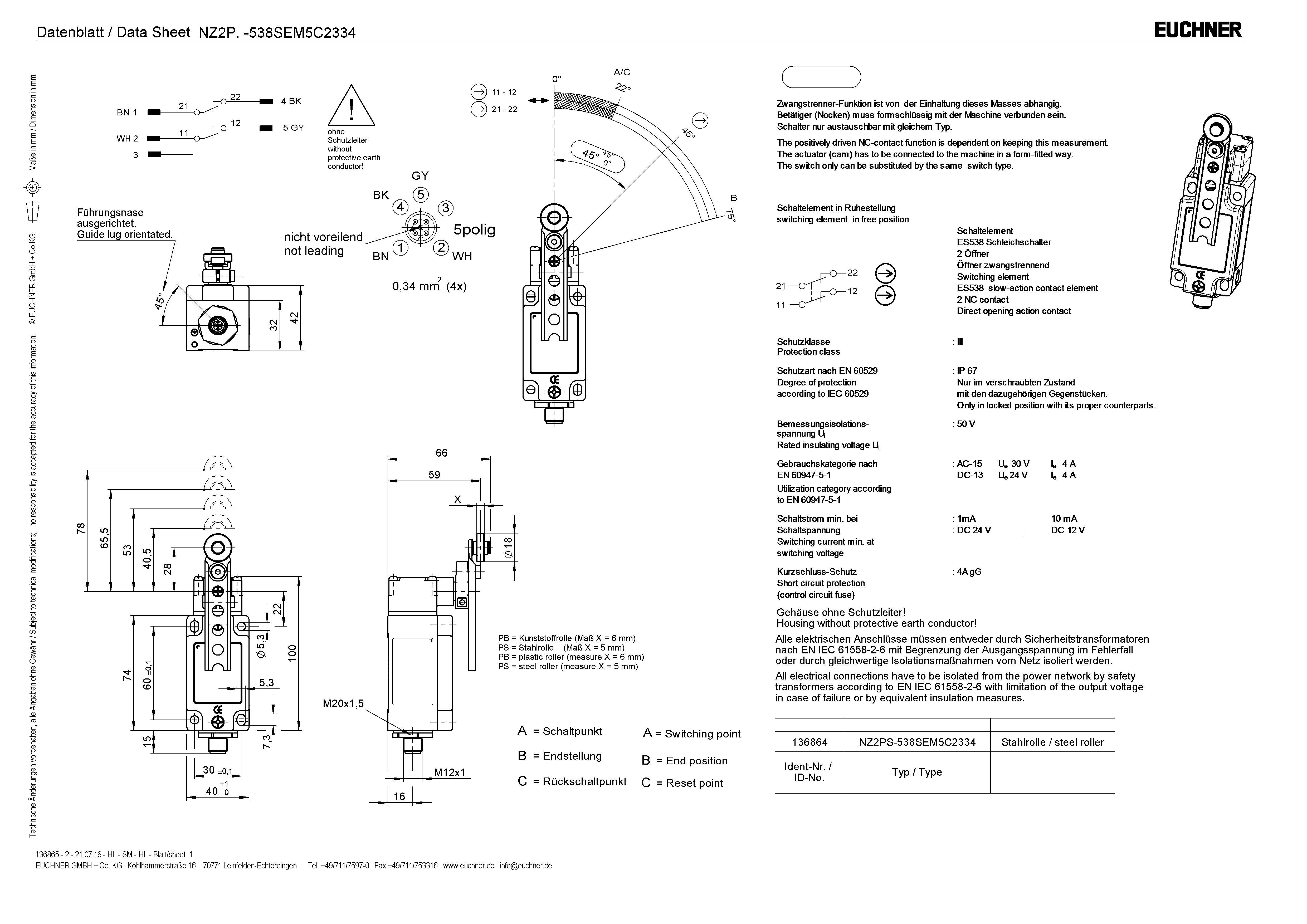 HomeProductsElectromechanical safety switches without guard lockingN1A / NB01 Single Limit Switch, NZ position switch and EGZ single fixing limit switchNZ2PS-538SEM5C2334