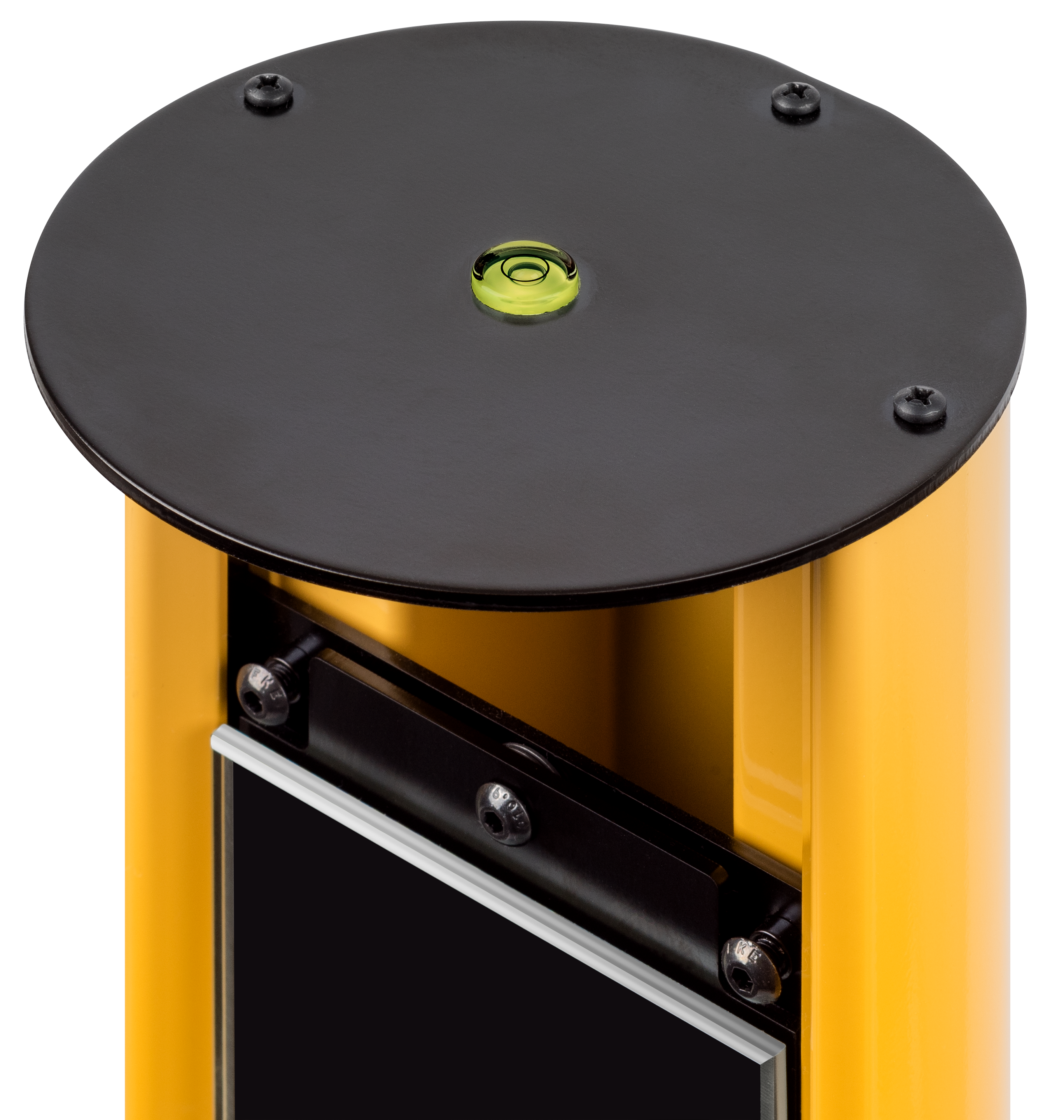 - Straightforward adjustment using spherical circular level in the cover