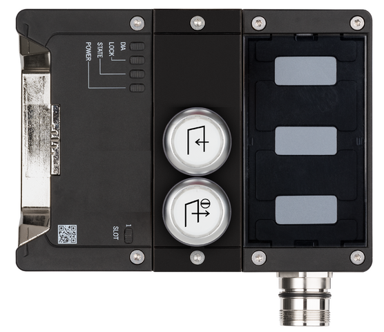 Interlocking module MGB2-I-BR... (M23, 2 pushbuttons, door hinge on left)