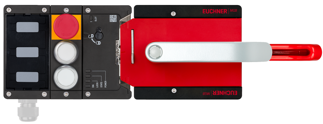 Locking module MGB2-L2-BR... (2 pushbuttons, emergency stop, open-circuit current principle, door hinge on right)