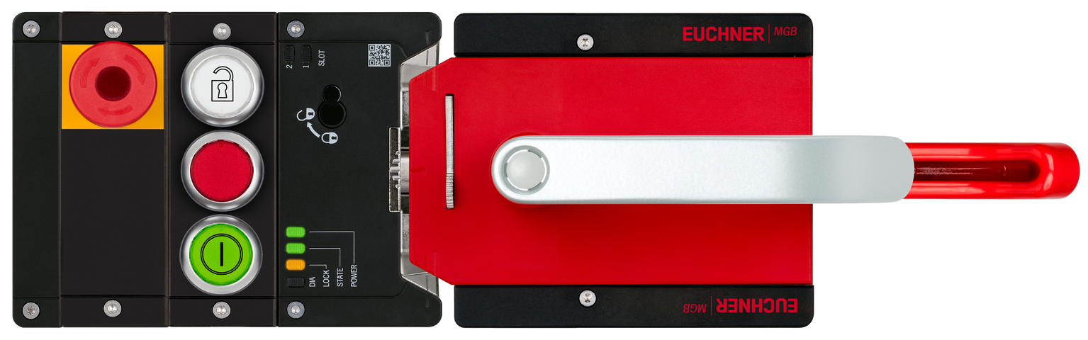 Locking set MGB2-L1... (2 pushbuttons, illuminated with symbol, 1 illuminated pushbutton, emergency stop, closed-circuit current principle, door hinge on right)