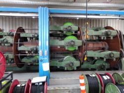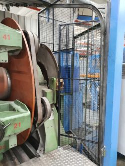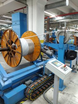 Detrás de dos puertas enrollables con ventana, la cableadora gira en torno a su eje horizontal a una velocidad constante. Alrededor hay varios tambores montados en soportes devanadores. Un cabrestante motorizado de doble polea estira los haces de conductores que salen del área de seguridad de la máquina. El cable multiconductor pasa por una estación de encintado antes de llegar finalmente, trenzado y bobinado, al tambor de arrollamiento. La planta de producción de Lapp fabrica cables especiales de hasta 24 hilos, que posteriormente se utilizan sobre todo como servocables en accionamientos. Una vez que todas las compuertas están cerradas, el proceso de fabricación se lleva a cabo de manera prácticamente automática. La máquina, construida en 1991, ha sido renovada recientemente y ahora cumple las últimas normas electromecánicas, de control y de seguridad, además de contar con una certificación CE actual.
