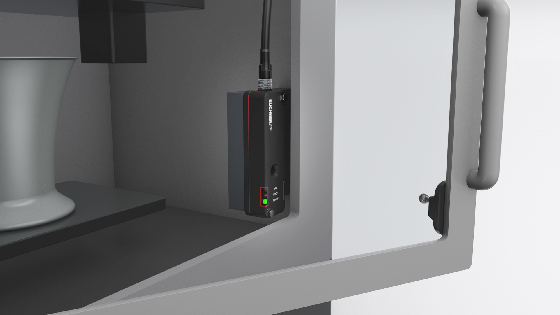 El nuevo bloqueo CTM con codificación por transponder, desarrollado especialmente para el uso en trampillas pequeñas y puertas ligeras de máquinas de embalaje, impresiona por sus pequeñas dimensiones. Es uno de los dispositivos de bloqueo más pequeños del mercado mundial y permite proteger procesos y personas en el mínimo espacio. El actuador de bola con soporte de elastómero hace posible la protección de puertas con radios de giro extremadamente reducidos. Todo ello ofrece a los constructores una nueva libertad: la de integrar el bloqueo en el diseño de la máquina de forma casi invisible. El CTM garantiza el máximo grado de protección, el IP69, y está disponible en versión higiénica. Además, gracias a las funciones de comunicación inteligentes, está perfectamente preparado para el futuro de la industria 4.0.