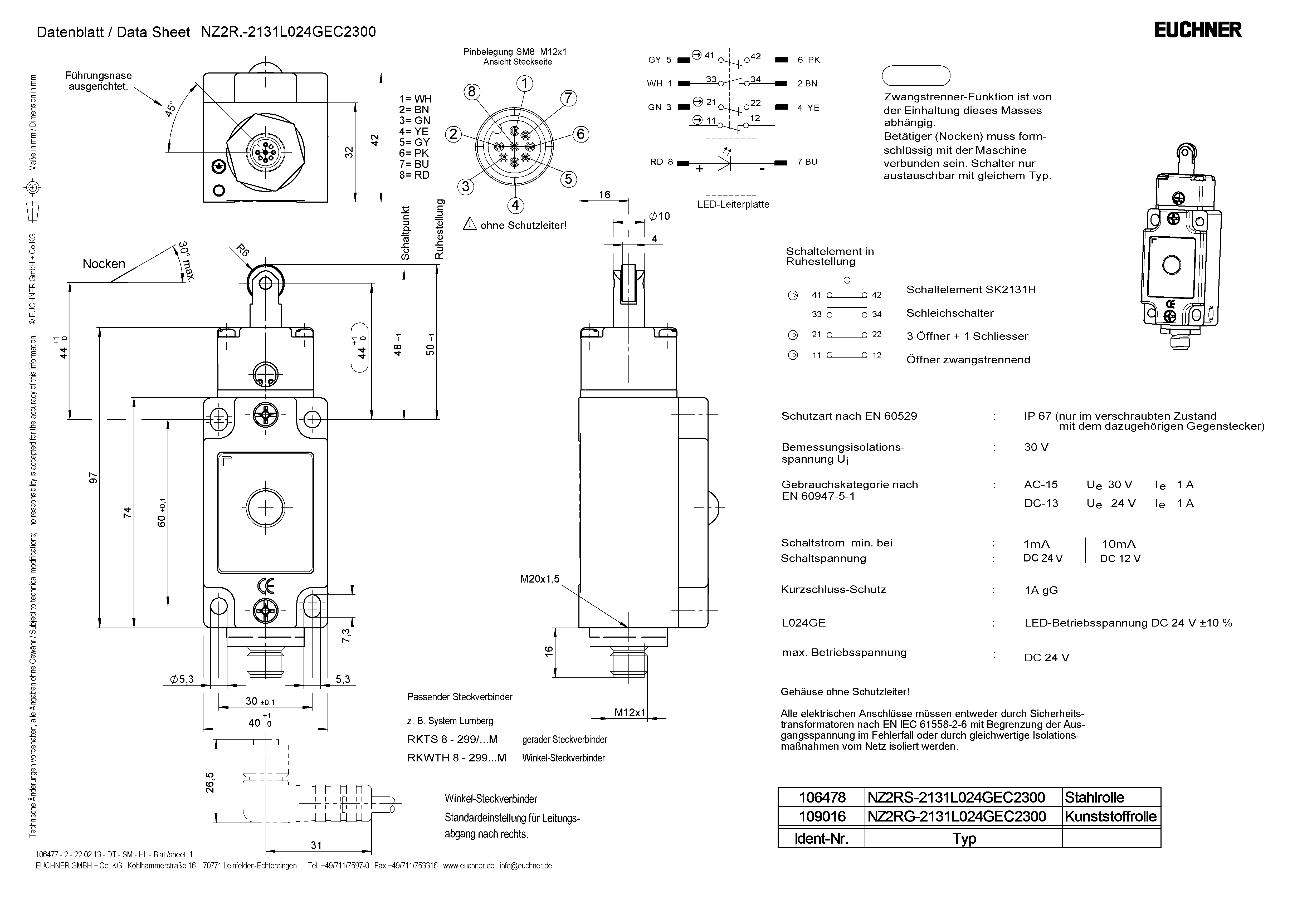 AccueilProduitsInterrupteurs de sécurité électromécaniques sans interverrouillageN1A / NB01 Boîtier monopiste, NZ Interrupteur de position et EGZ Monopiste(s)NZ2RS-2131L024GEC2300