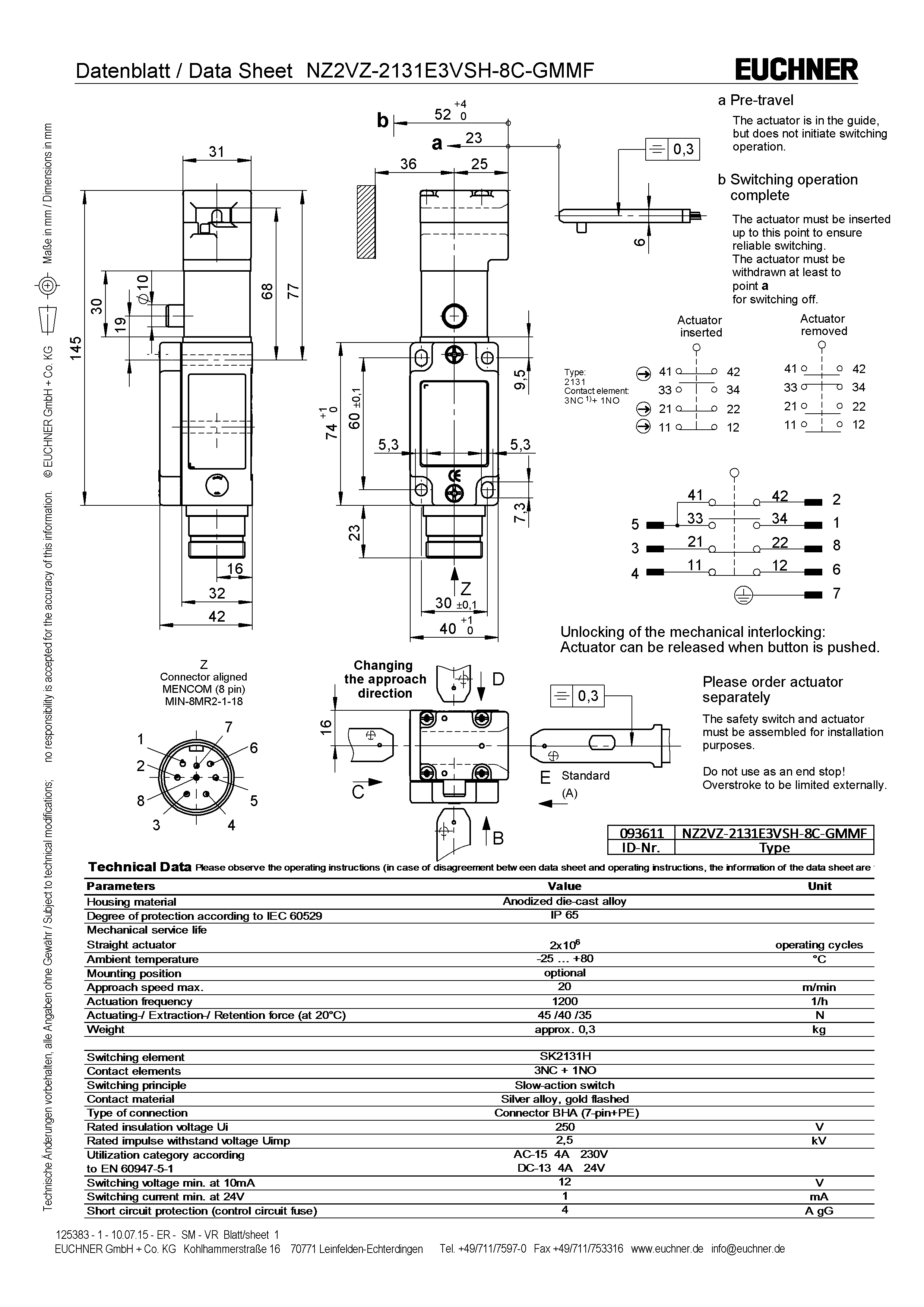 Safety switch NZ.VZ.VSH, plug connector MR8 (manual release)