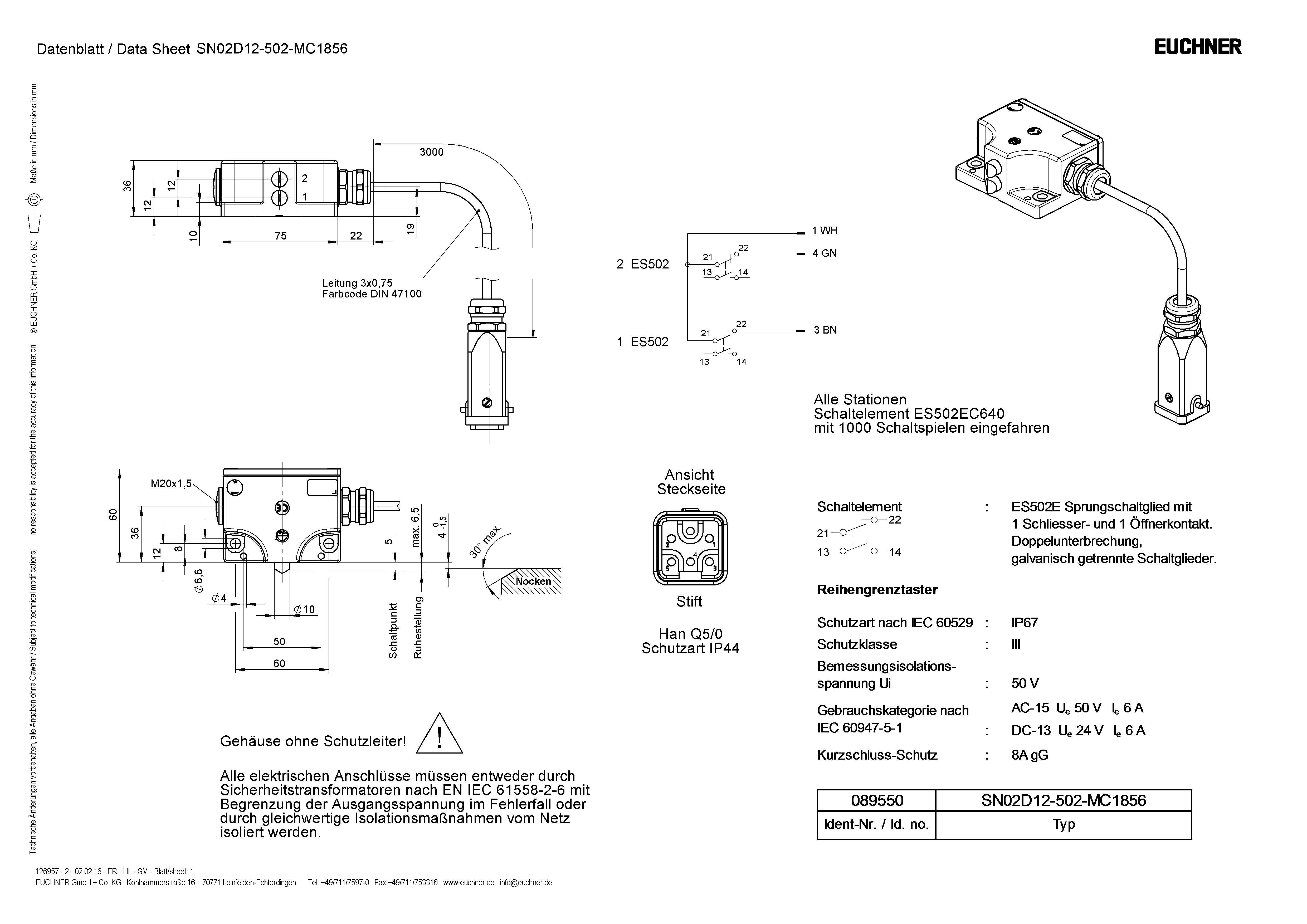 | 7 | Switching element: ES502E snap-action switching contact with 1 normally open and 1 normally closed contact. Double gap contacts, electrically isolated switching contacts. |