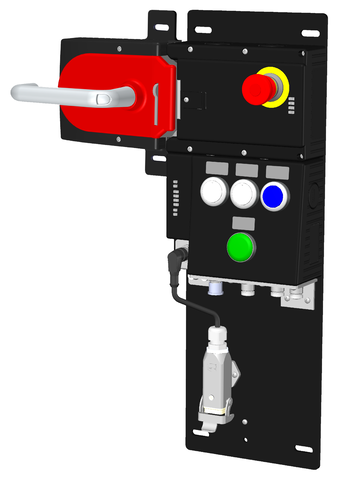 잠금 모듈 MGB-L2...-EI(솔레노이드 힘에 의한 가드 잠금) 푸시버튼 3개, 인디케이터 1개 및 비상 스톱 장착