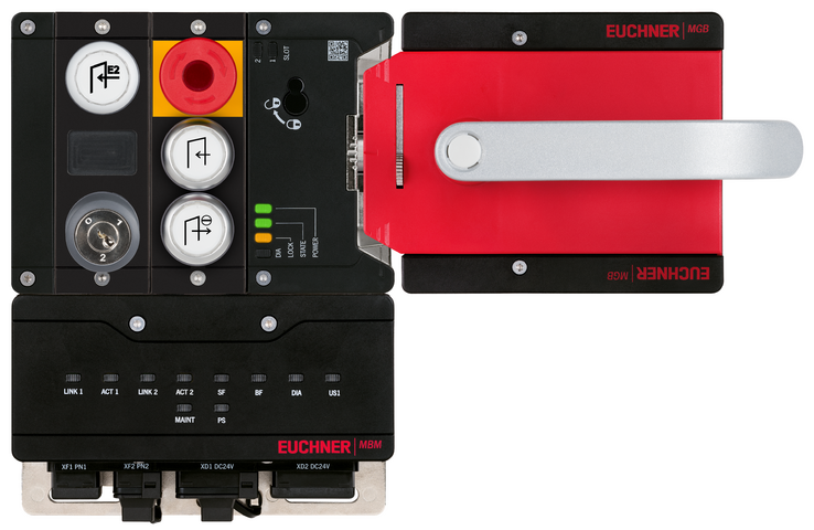 잠금 모듈 MGB2-L1-MLI... (푸시버튼 2개, 비상 스톱, 키 작동식 회전 스위치, 인디게이터용 커버, 폐쇄회로 전류 원리, 우측에 도어 경첩)