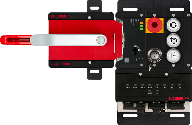 평가 세트 MGB2-L1...-PN(푸시버튼 3개, 비상 스톱, 인에이블링 스위치 연결용 플러그 커넥터 M23, 폐쇄회로 전류 원리, 도어 경첩 좌측)