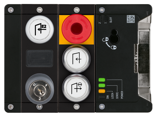 잠금 모듈 MGB2-L1-MLI... (푸시버튼 2개, 비상 스톱, 키 작동식 회전 스위치, 인디게이터용 커버, 폐쇄회로 전류 원리, 우측에 도어 경첩)