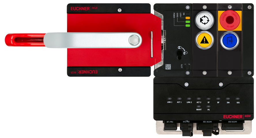 잠금 모듈 MGB2-L1-MLI... (푸시버튼 3개, 비상 스톱, 폐쇄회로 전류 원리, 좌측에 도어 경첩)