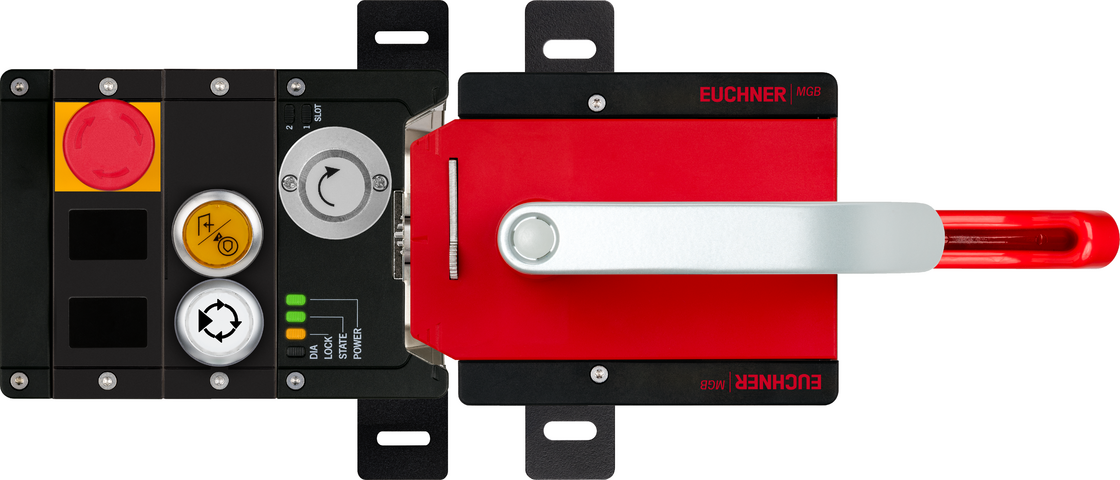 잠금 모듈 MGB2-L1-MLI... (푸시버튼 2개, 비상 스톱, 비상 릴리스, 폐쇄회로 전류 원리, 우측에 부착된 도어 경첩, 마운팅 플레이트에 장착)
