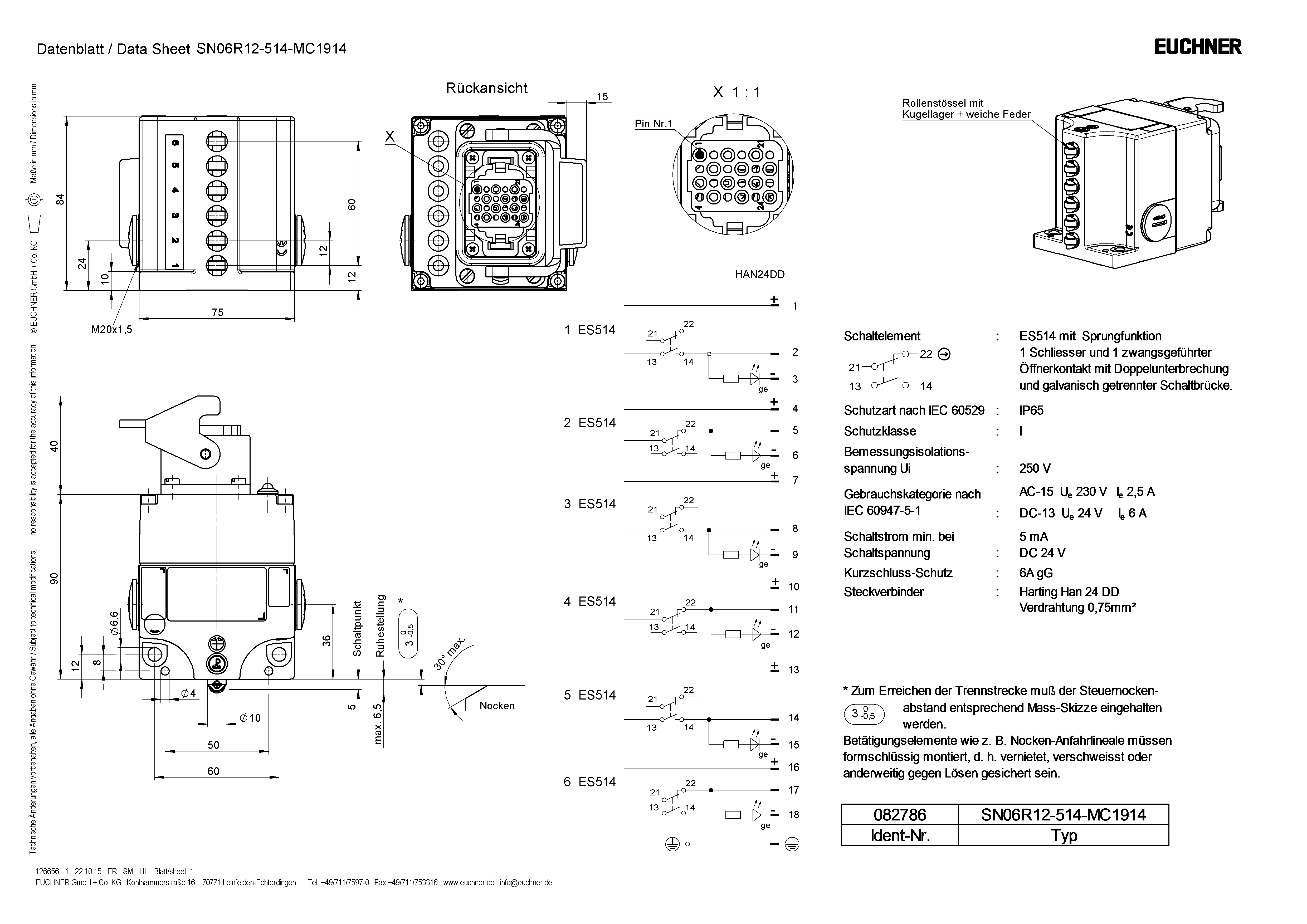 | 7 | Elemento de comutação ES514 com função de ação rápida: 1 Contato de trabalho e 1 contato de abertura de condução forçada com interrupção dupla e ponte de comutação separada galvanicamente. |