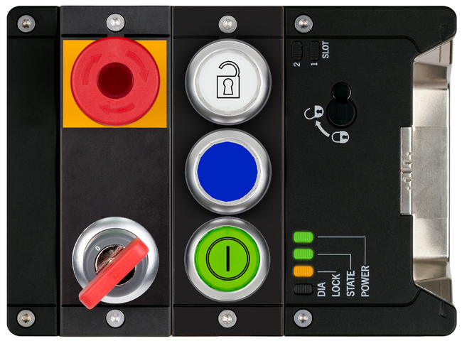 Módulo de bloqueio MGB2-L2-MLI... (3 botões de pressão, parada de emergência, interruptor com chave, princípio de circuito aberto, batente da porta à direita)