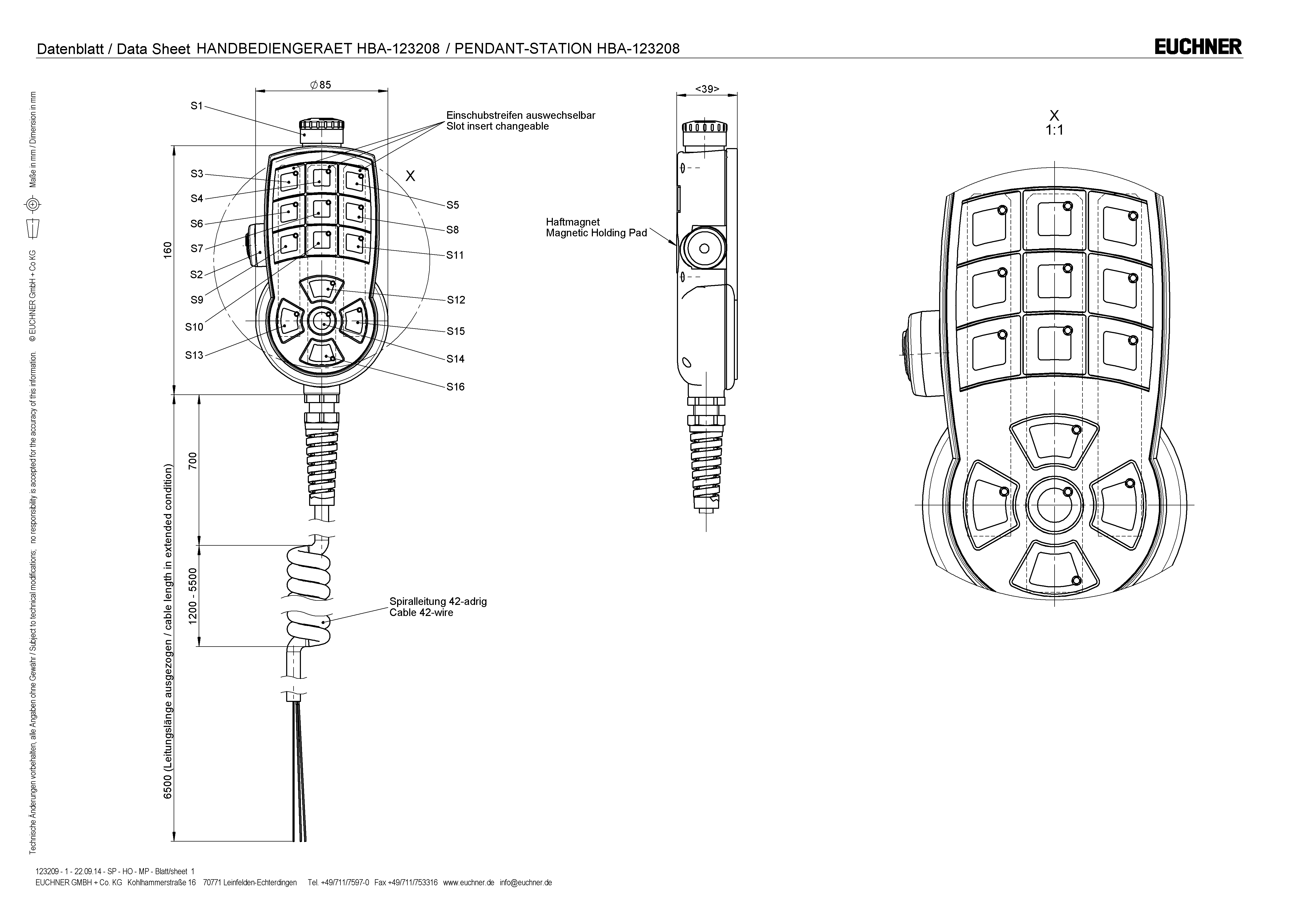 Hand-held pendant station HBA, EMERGENCY STOP device, enabling switch, pushbuttons, membrane keypad, LEDs